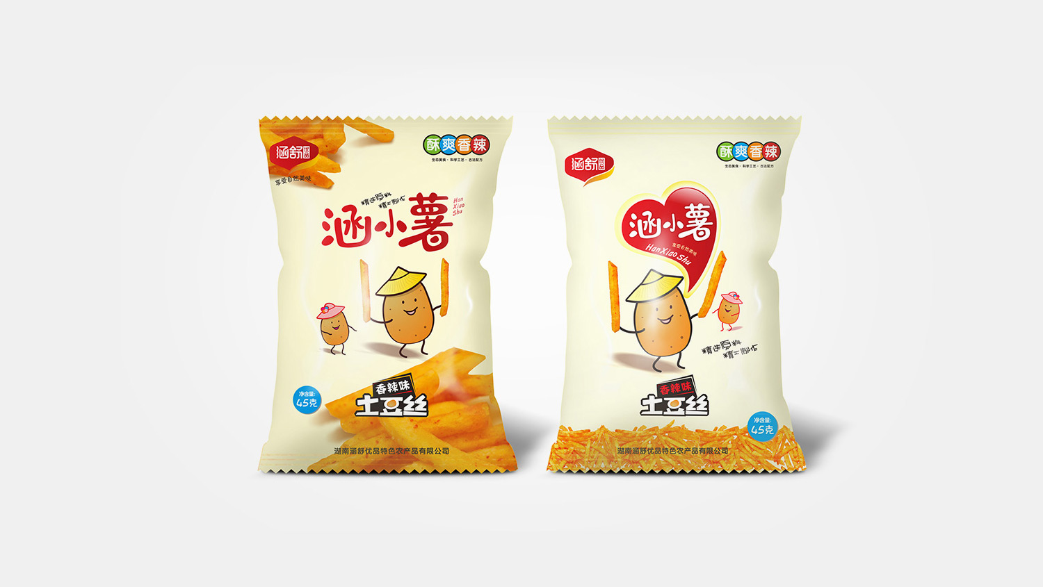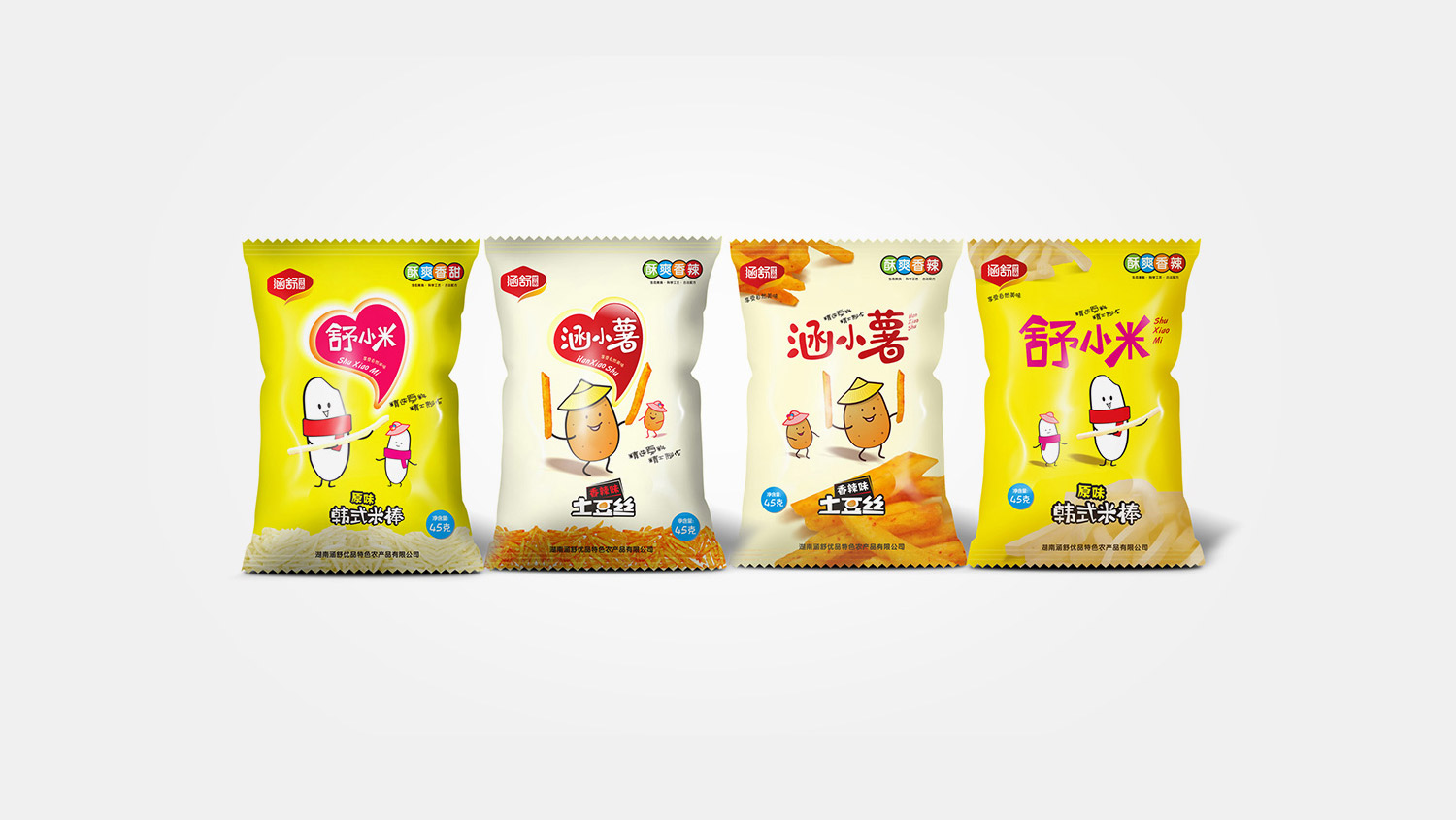 涵小薯与舒小米 以产品本色原材料为原型,设计为萌萌的卡通造型,既增加包装的趣味性,也大大增加了消费者购买欲望!
